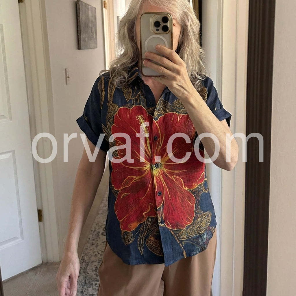Channel island vibes with this Bold Tropical Hibiscus Print Top, a vibrant statement piece that brings the essence of paradise to your wardrobe. Crafted from lightweight, breathable fabric—likely cotton or linen blend—it features a rich navy base adorned with a striking oversized red hibiscus flower outlined in golden yellow, complemented by intricate leafy patterns throughout. The classic short-sleeve shirt design includes a relaxed fit, button-down front, and rolled sleeves for an effortless, laid-back look. Perfect for pairing with denim jeans, high-waisted shorts, or flowy skirts, this top is ideal for beach days, tropical getaways, or summer city strolls. Its bold floral motif exudes bohemian charm and exotic flair, making it a standout choice for those who love fashion with personality. Inspired by the playful, romantic styles found on sites like Lulus, this shirt effortlessly blends artistry and comfort—ideal for adding a splash of color and confidence to your warm-weather wardrobe.