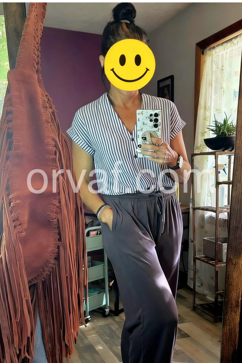This V-neck top features vertical blue and white stripes with a front button closure. Rolled short sleeves add a relaxed, breezy touch. Lightweight fabric perfect for warm days. Pair with jeans or shorts for a timeless look. Effortlessly chic and easy to style.