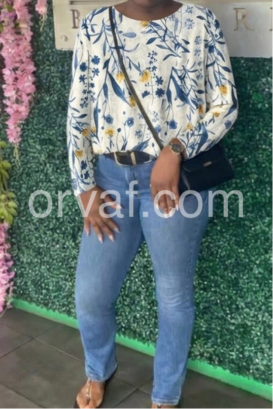 Trendy Blue Floral Round Neck Top