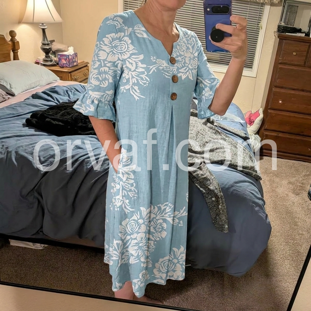 Blue Floral Ruffle Sleeve Button Linen Maxi Dress