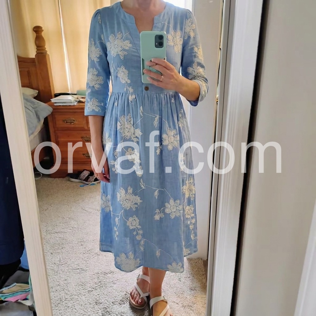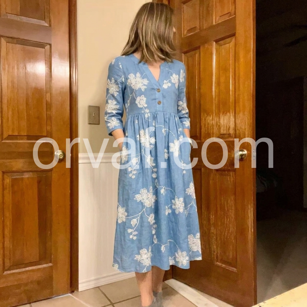 Crafted to solve the "plain linen dress" pain point, this dress is adorned with intricate floral embroidery that adds artistry to everyday wear. The V-neck flatters the bust, while the pleated waist cinches without squeezing.