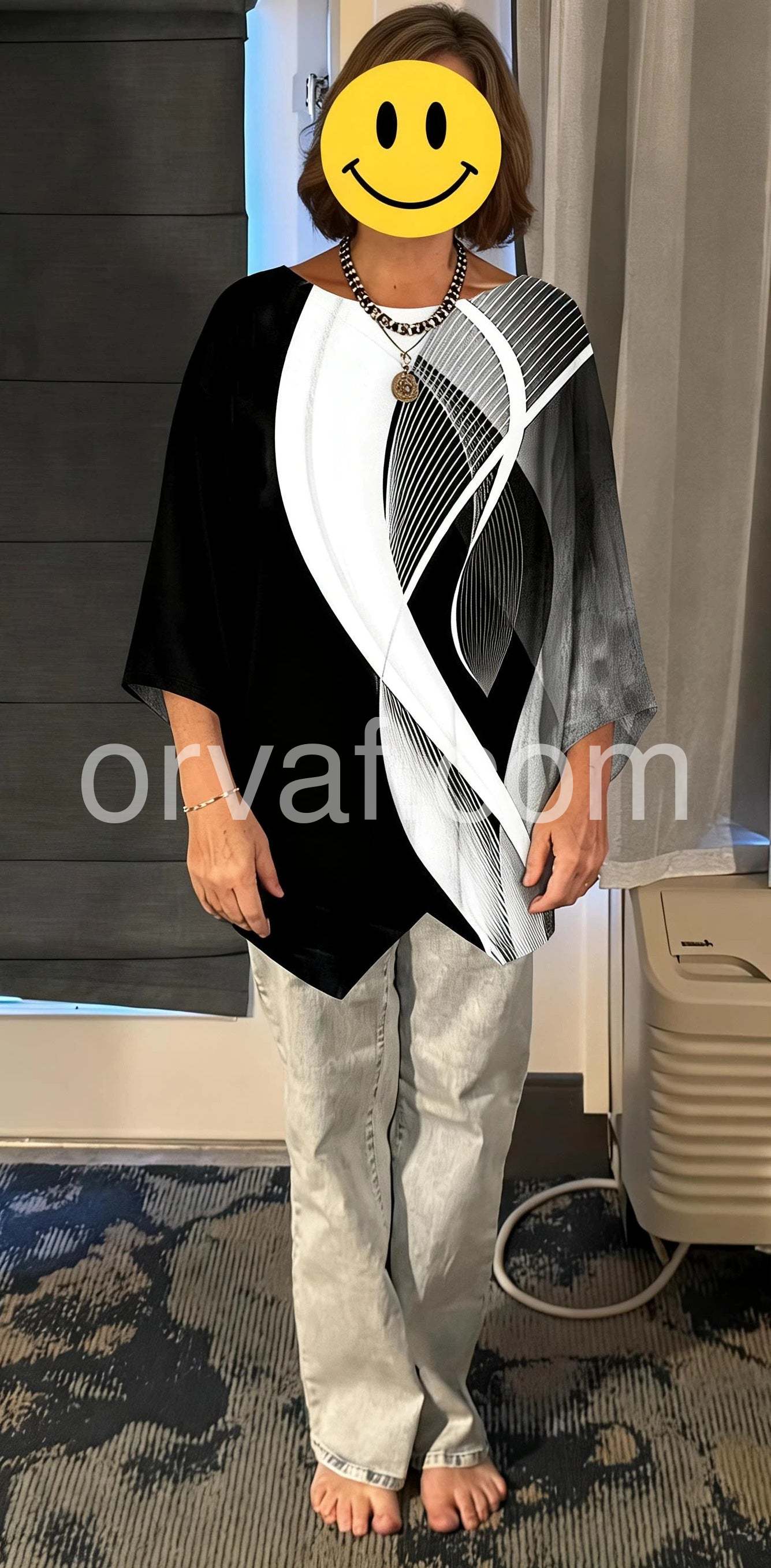 Refresh your attire with this modern geometric long-sleeve tunic top. Black and white swirls give it an abstract style complemented by an asymmetrical uneven hem and long sleeves for added coverage. Wear slacks or jeans and take your day look into the night.