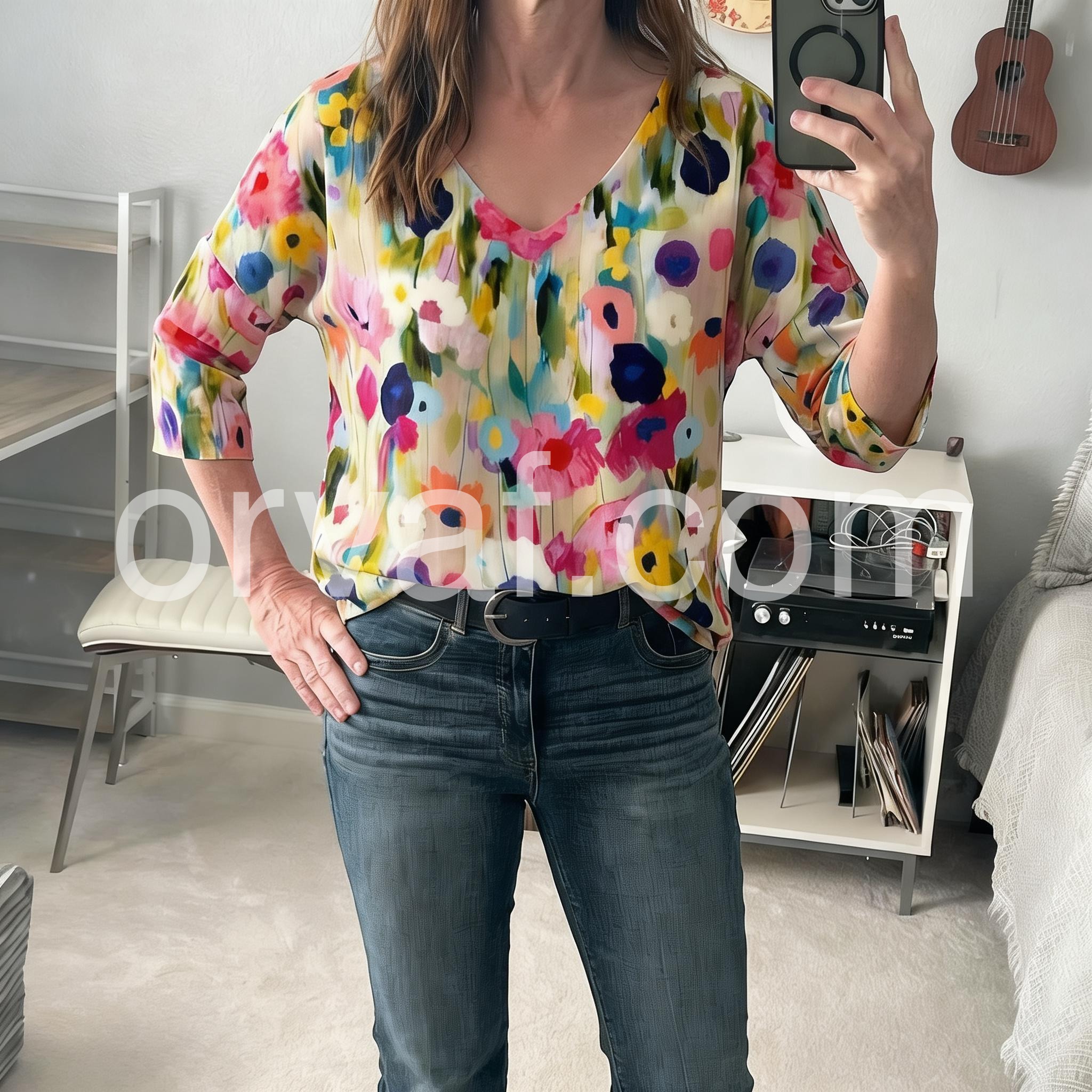 This flowy top features a colorful watercolor floral print on a soft beige base. Deep V-neckline and three-quarter sleeves with rolled cuffs. Lightweight fabric perfect for warm weather. Ideal for casual wear or beach outings. Effortlessly stylish and full of summer spirit.
