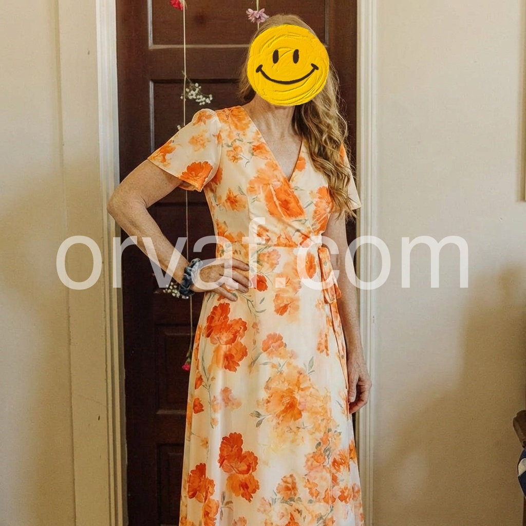 Orange Floral V-Neck Wrap Midi Dress