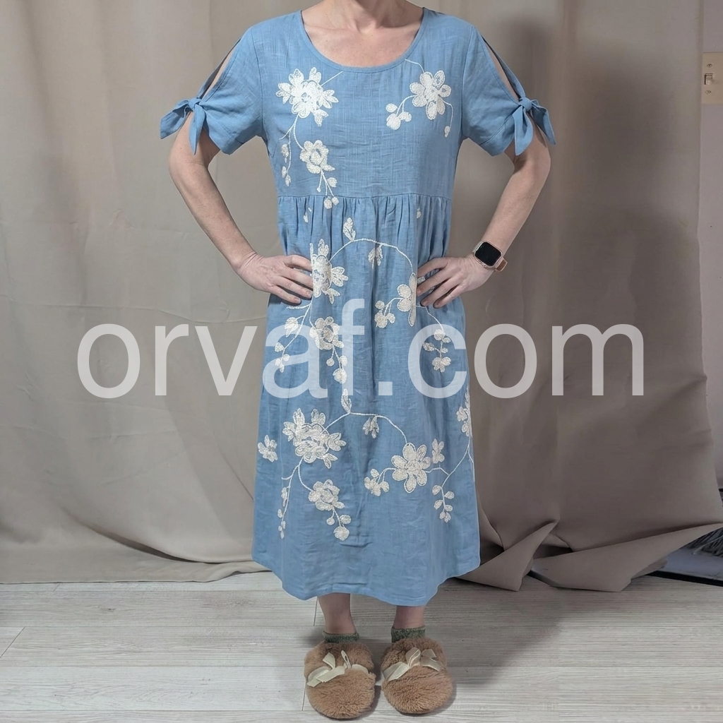 Designed to fix the "boring summer dress" pain point, this dress features intricate floral embroidery that elevates basic linen. The tie sleeves solve the "arm fat" concern, while the flowy tiered hem skims over hips and thighs.