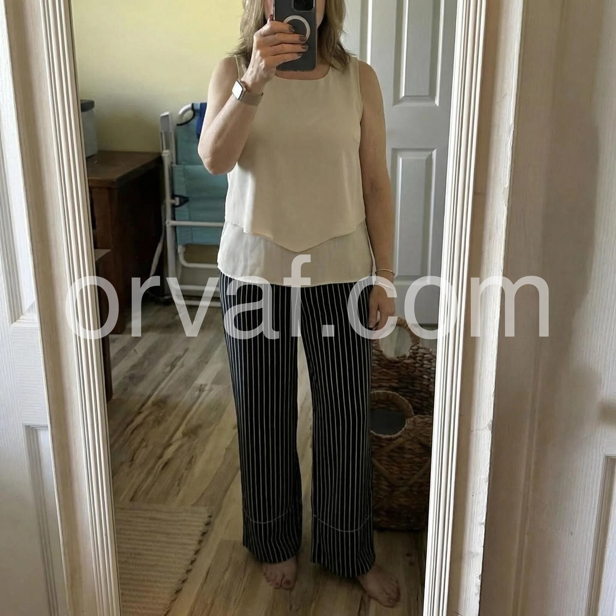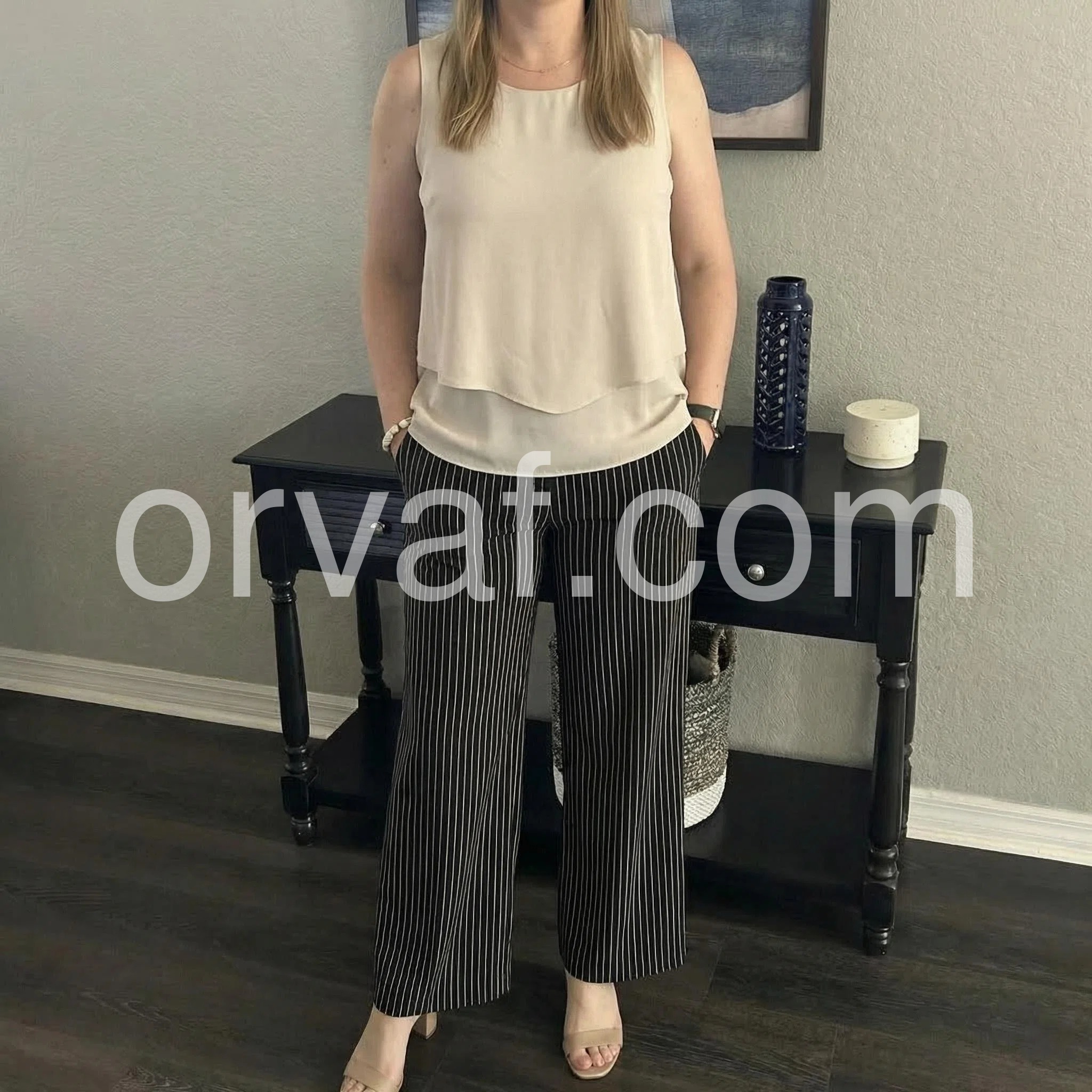 The vertical stripes on these wide-leg pants are incredibly slimming and make me look taller. The contrasting cream top balances the whole look beautifully.