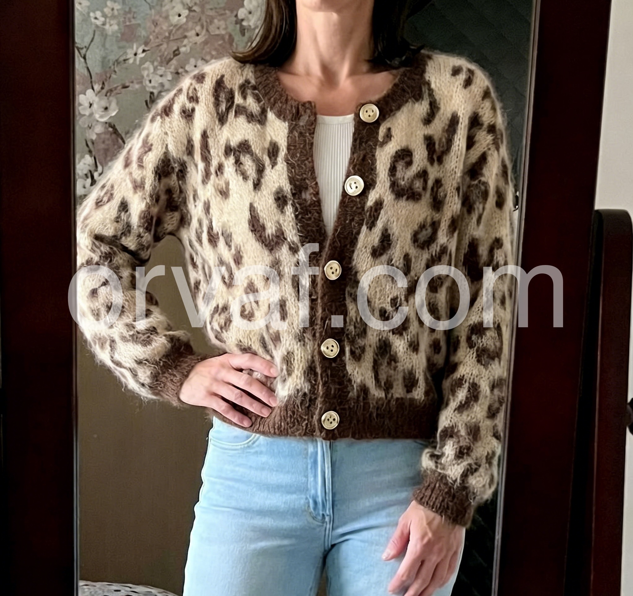 This leopard print cardigan is my new obsession! The fuzzy mohair-like fabric is incredibly soft and warm, perfect for chilly autumn days. The oversized fit and vintage buttons add a cozy, retro vibe. I paired it with leather pants, and it instantly elevated my look—so chic and timeless. I’ve gotten so many compliments already!