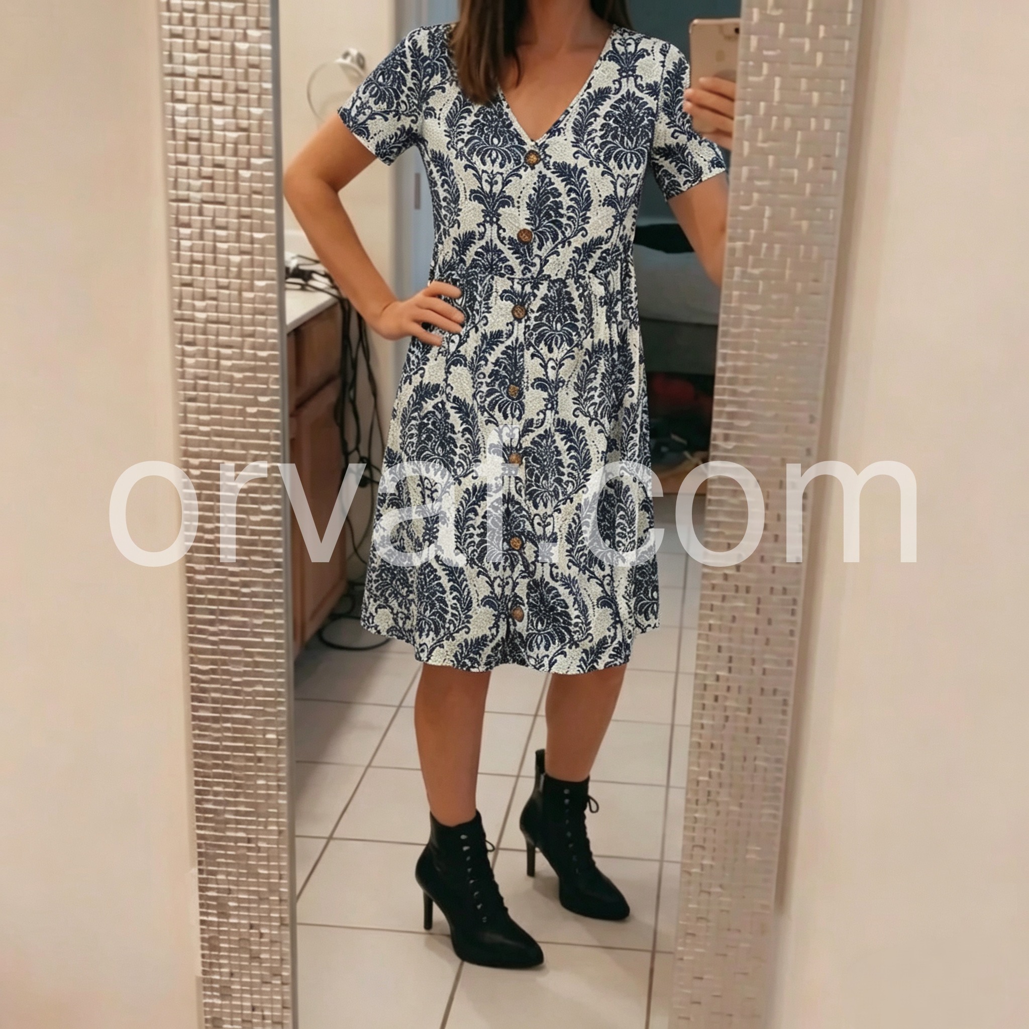 This dress solves the common “frumpy vs. too tight” dilemma in everyday wear. The elegant damask-style floral print in navy and off-white feels timeless and refined, avoiding overly loud patterns that date quickly. The relaxed A-line silhouette skims gently over the hips and midsection, making it comfortable and flattering for all-day wear.