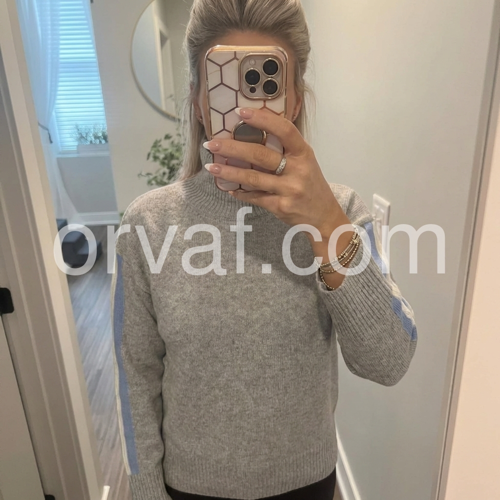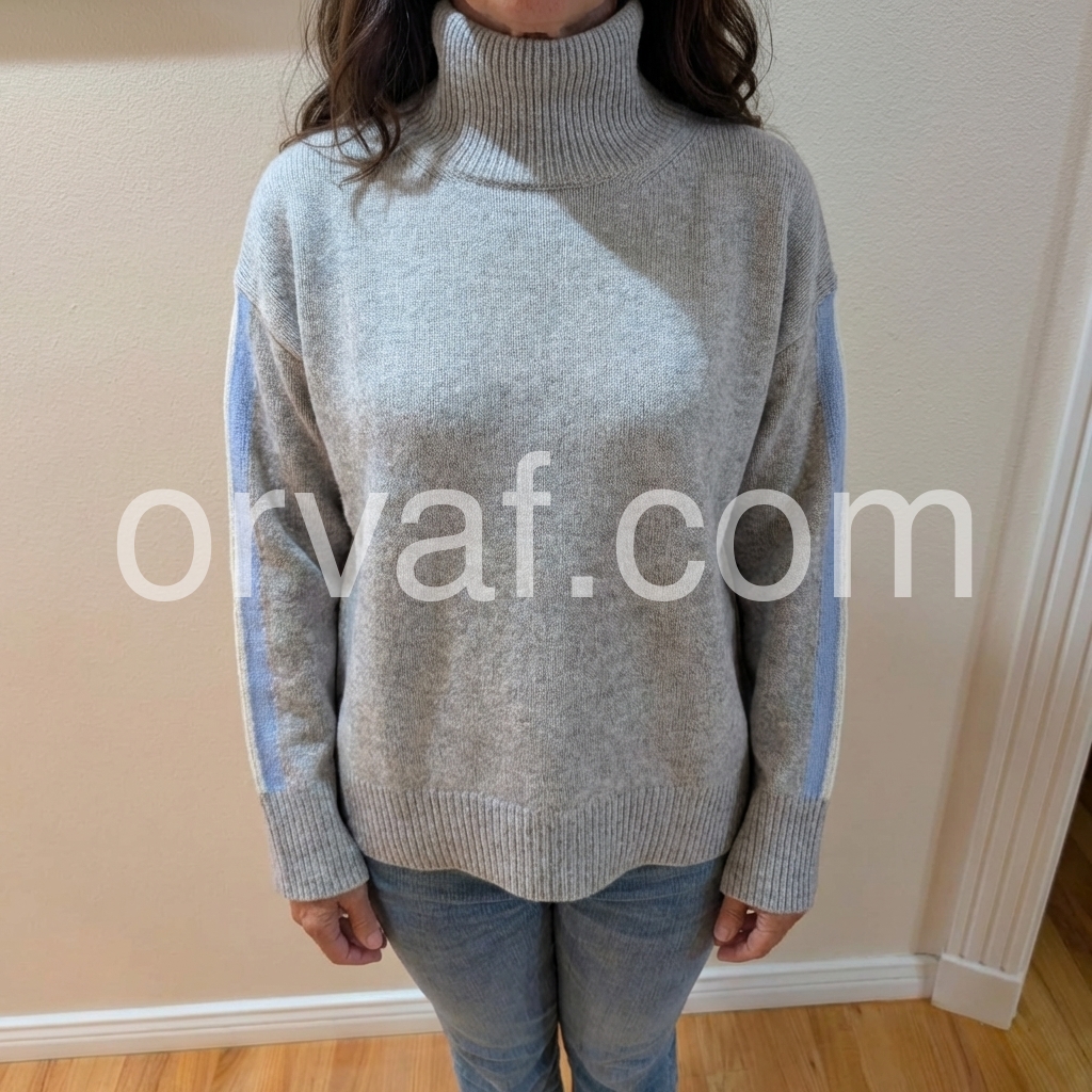 When I first received this grey sweater I wasn't sure if I liked it. One I tried it on I did like it. It fits well and I liked the design of the sweater. I like the high-neck, which isn't too cold. The sweater is comfortable and lightweight for cool days. I think it is a good value for the price.