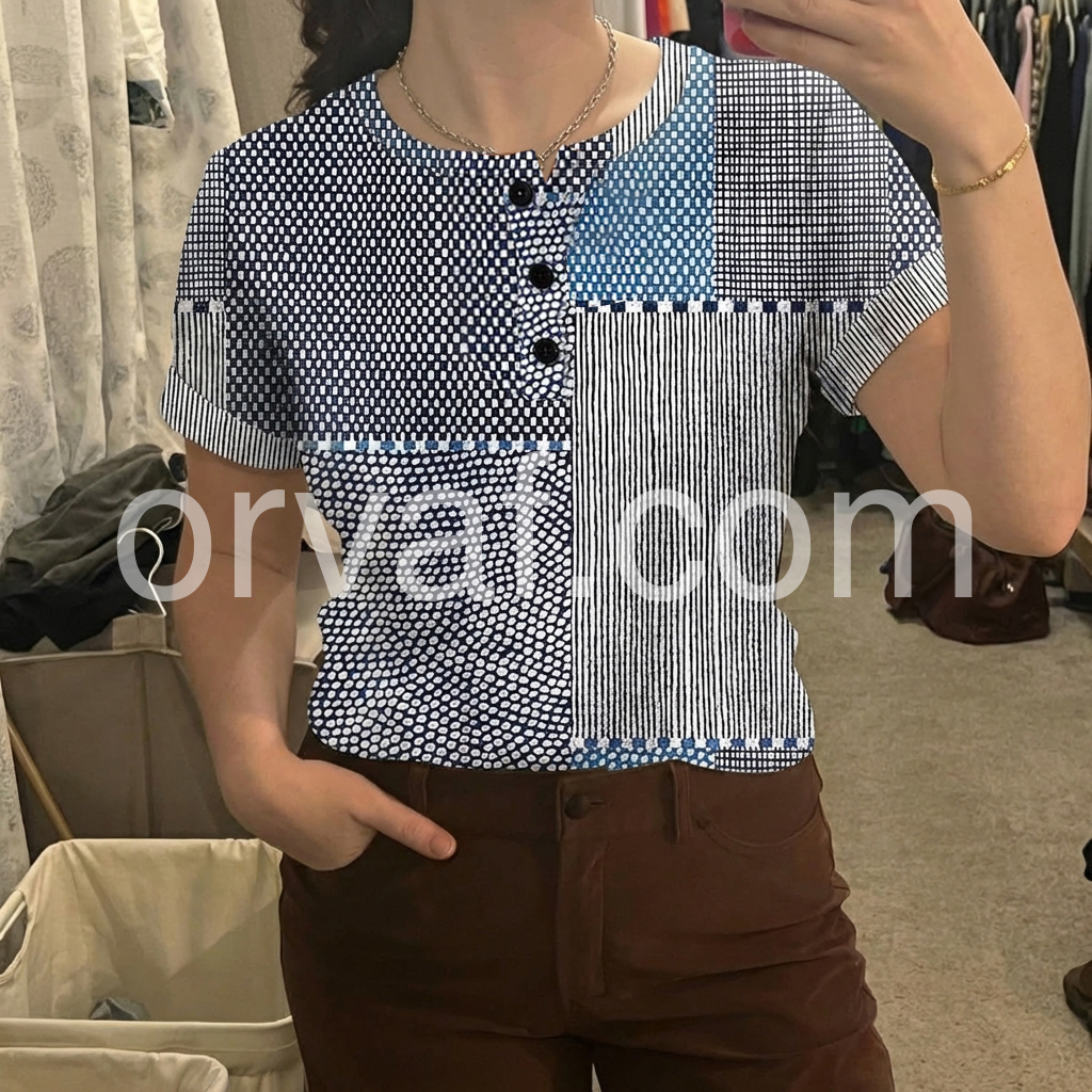 I absolutely love the patchwork design on this top! It is so unique with the mix of stripes and polka dots. The fit is true to size and very flattering. Perfect for casual Fridays at work or a weekend outing.