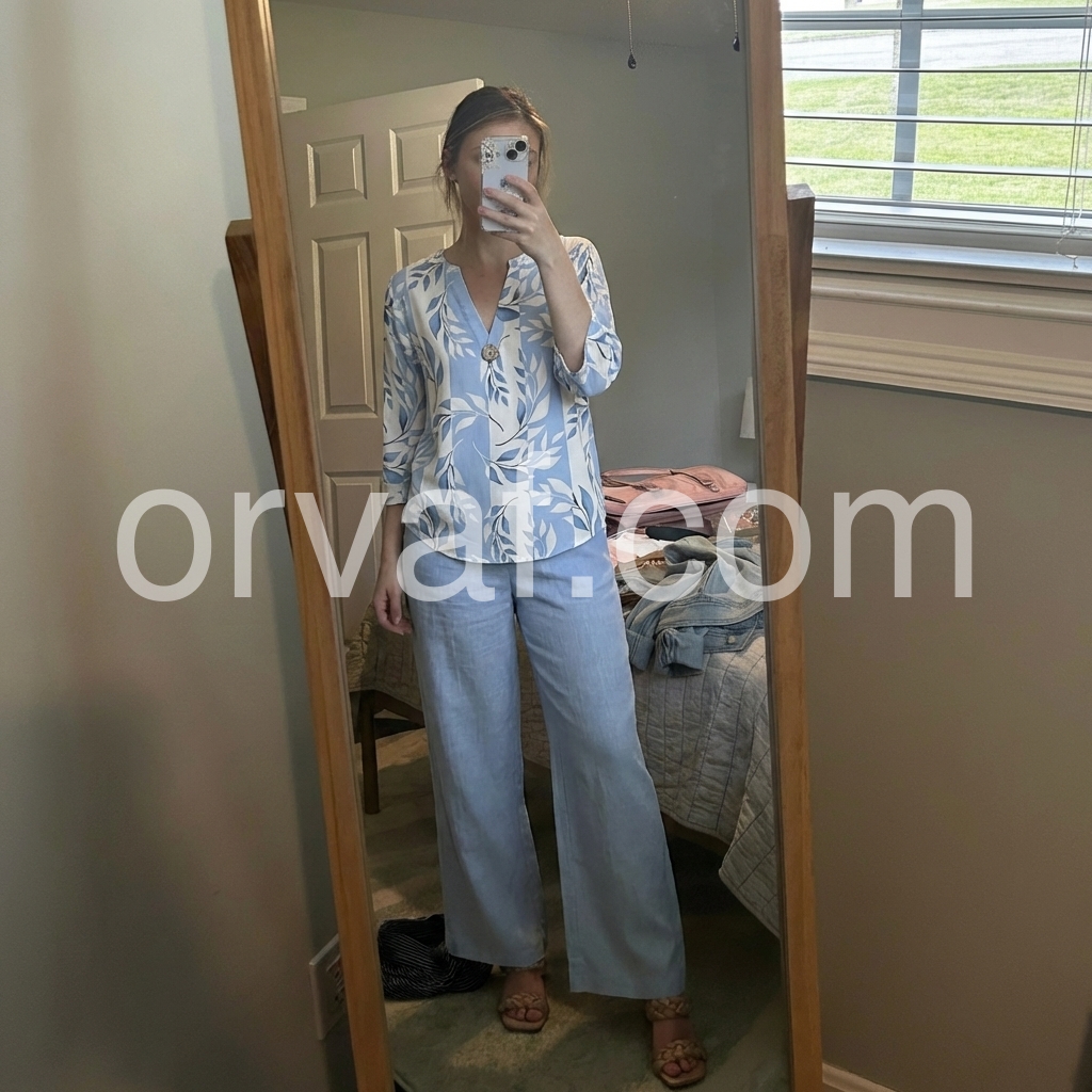 Hey fashionistas! This two-piece set is a total game-changer. The V-neck top with blue and white prints is super flattering, while the three-quarter sleeves add a touch of elegance.