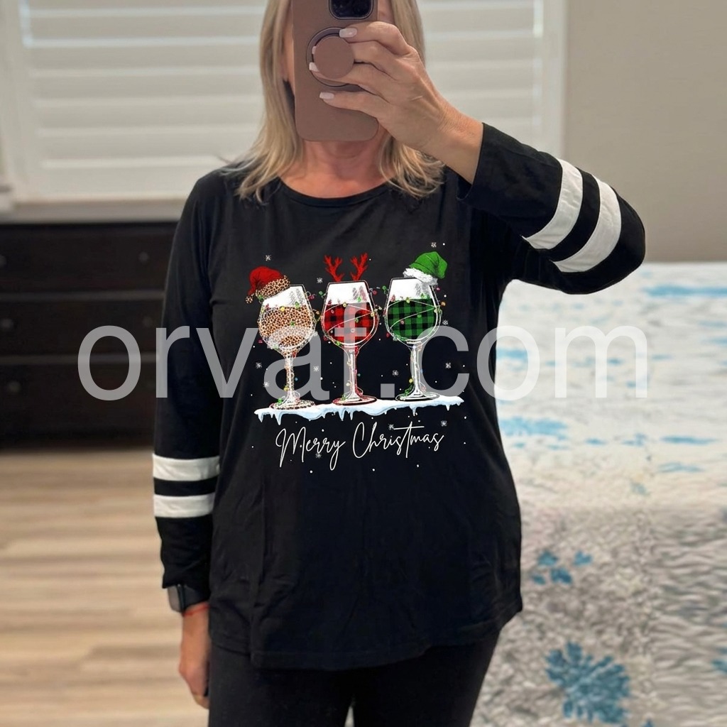 Cute holiday, 3/4 sleeve tunic. Beautiful print with Merry Christmas. Ordered size L. This is a little long for my preference but I can tuck or tie. I am 5’4” and 150.