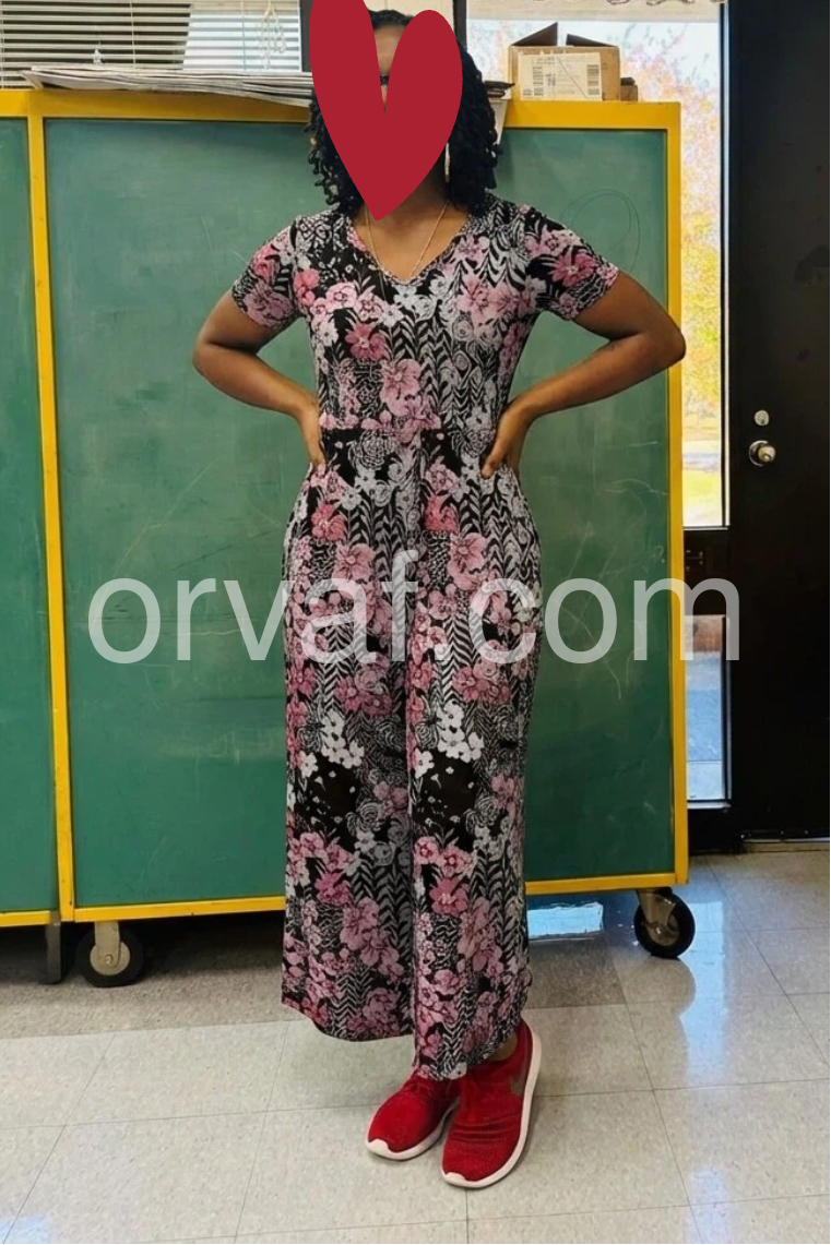 This V-neck jumpsuit features a bold floral pattern in soft pink and white on a black background. The short sleeves and wide-leg design offer a relaxed, stylish fit. Side pockets add practicality and ease. Lightweight fabric perfect for warm weather. Ideal for casual outings or summer days.