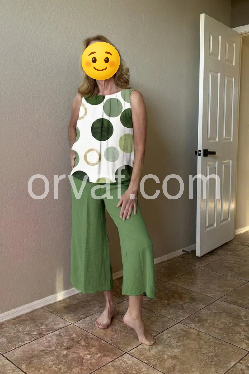 This coordinated set features a sleeveless top with bold green polka dots on a white background. Paired with solid olive-green wide-leg pants for a clean, contemporary look. Lightweight and comfortable fabric ideal for everyday wear. Perfect for casual outings or relaxed summer days. Stylish and easy to style.