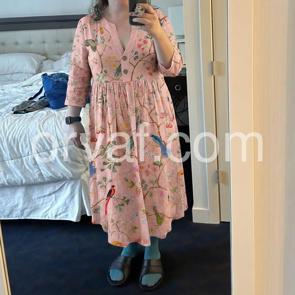 This three-quarter sleeve dress features a soft pink base with colorful birds and floral patterns. The V-neck and button front add vintage appeal. Side pockets offer comfort and convenience. Lightweight fabric perfect for spring and summer. Ideal for casual outings or garden parties.