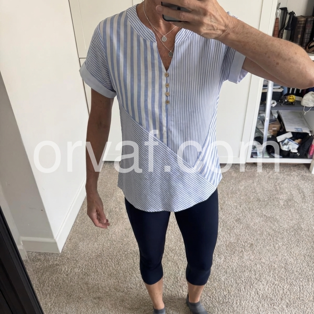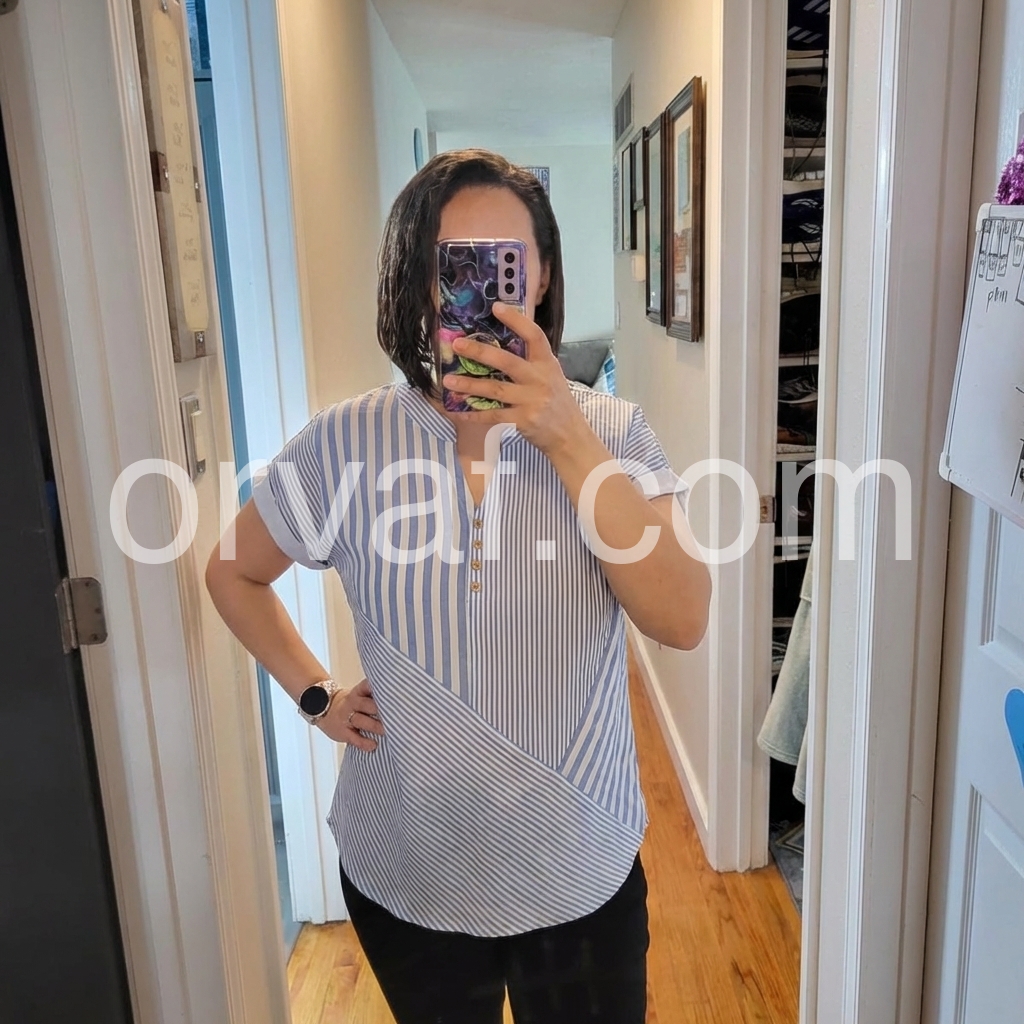 This short-sleeve top features vertical blue and white stripes. V-neckline with front buttons and a stylish wrap design. Cuffed sleeves add a polished touch. Lightweight and perfect for casual wear. Ideal paired with jeans or trousers.