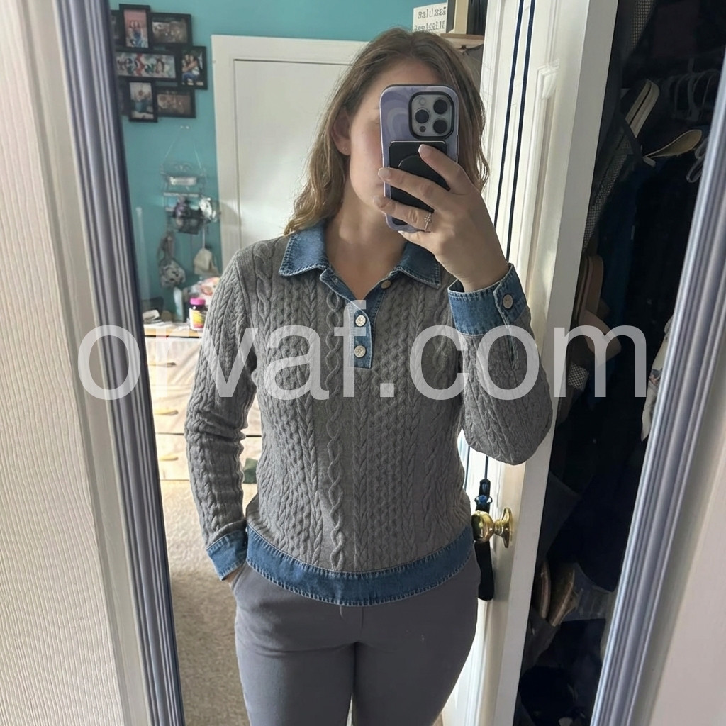 I’m really impressed by the design of this knit sweater. The gray cable pattern looks rich and detailed, and the denim accents make it feel more elevated than typical sweaters. The fit is comfortable and easy to style, and it holds up well when worn for a full day. I’ve already recommended it to friends!