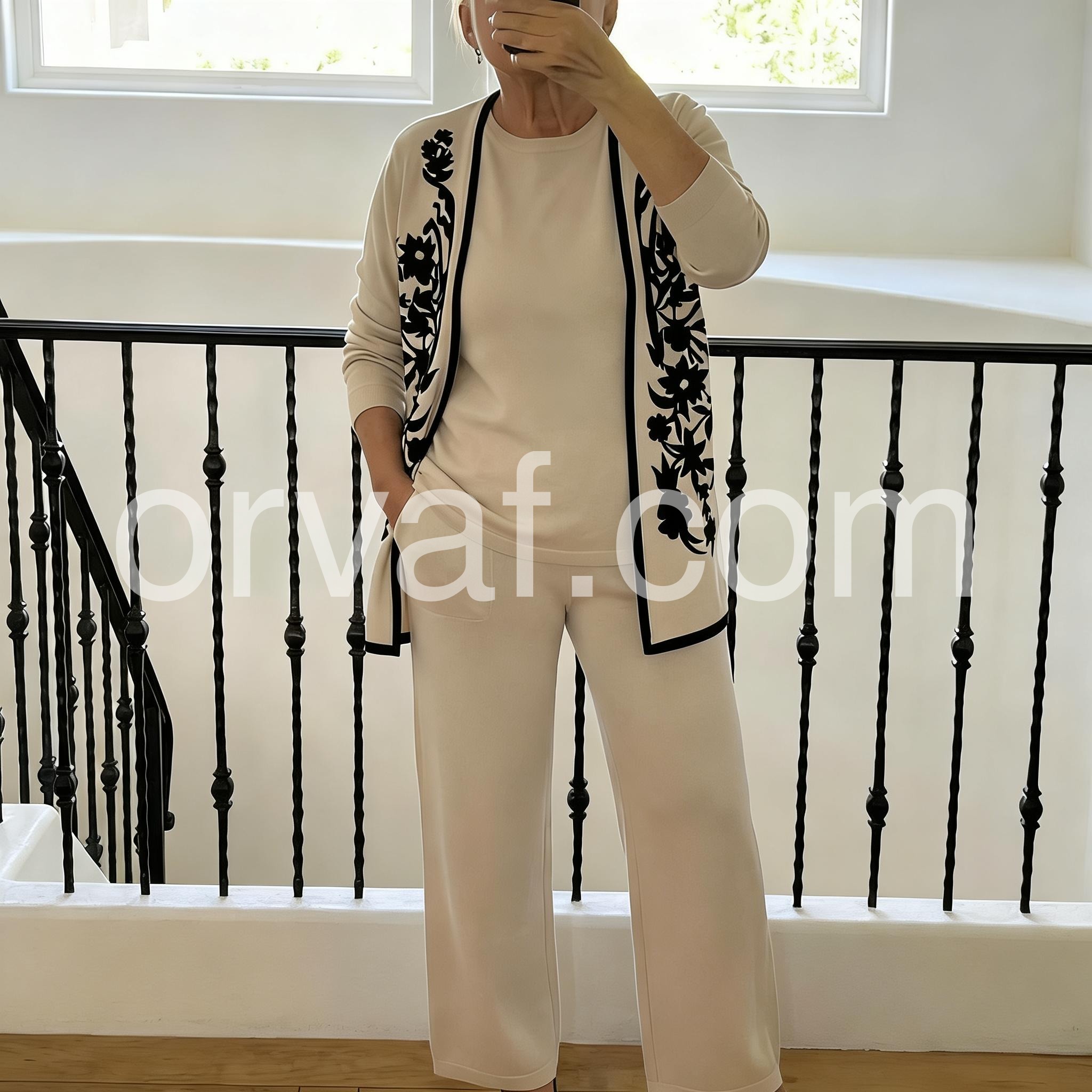 This coordinated three-piece set features a soft beige top, wide-leg pants, and an open-front cardigan with black floral embroidery. The clean lines and subtle contrast create a refined look. Perfect for casual outings or relaxed elegance. Comfortable, stylish, and effortlessly chic.