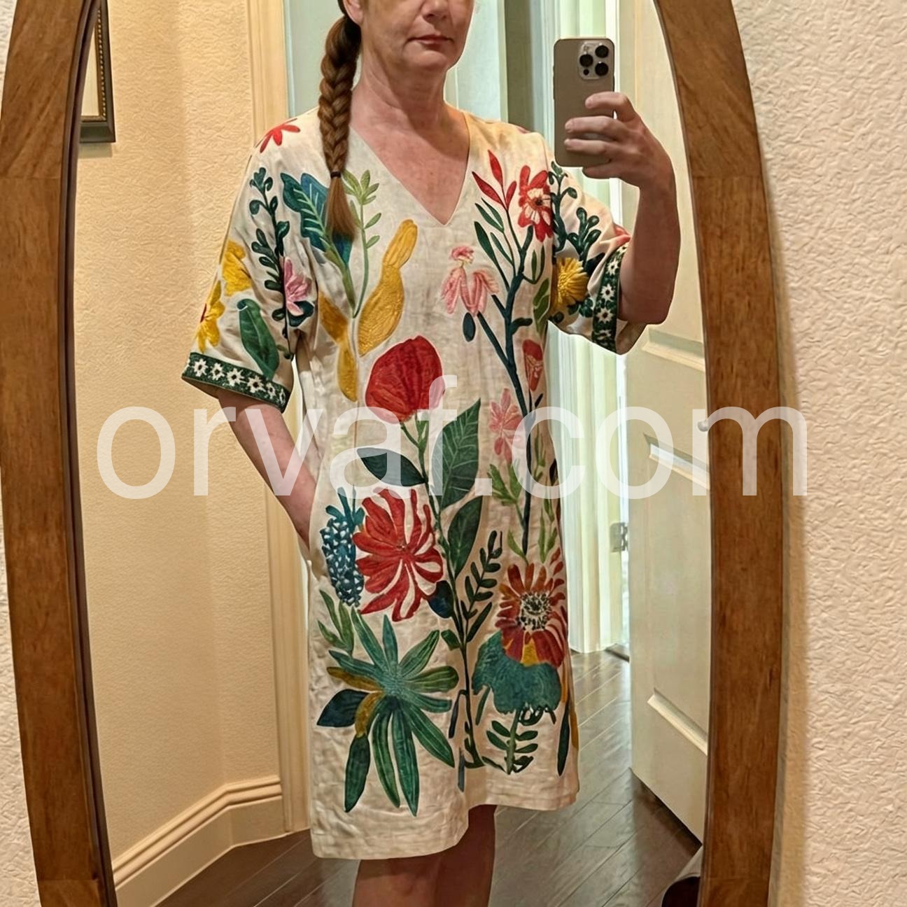 I bought this dress for my upcoming vacation to Cabo, and it is absolutely perfect! The fabric is lightweight and breathable, making it ideal for the hot weather. The floral print is so vibrant and summery. I wore it over my swimsuit to the beach and then straight to lunch. Highly recommend!