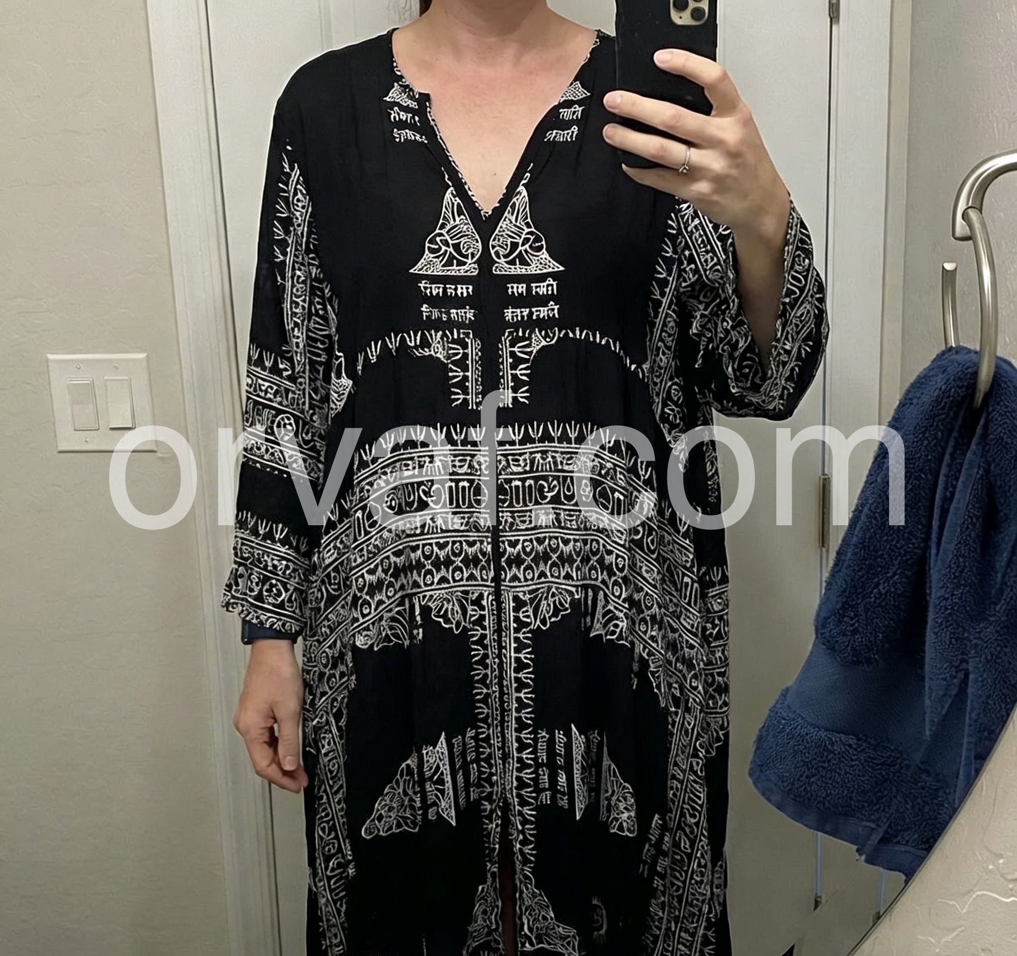 I’m obsessed with this black and white printed dress! The detailed ethnic patterns add so much character, and the oversized silhouette is both cozy and stylish. The fabric is soft and breathable, ideal for warm weather. I’ve worn it to brunch and a beach picnic, and it always gets compliments. It’s the ultimate piece for embracing a laid-back, boho vibe!